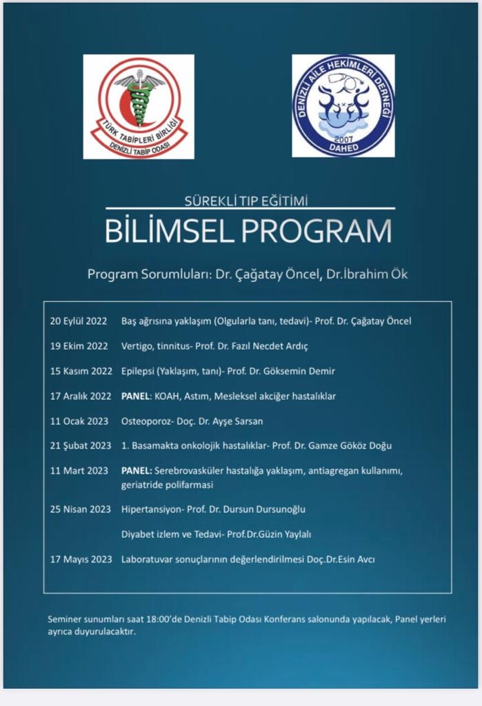 Denizli Tabip Odası ve Denizli Aile Hekimleri Derneği işbirliği ile hazırlanan sürekli eğitim programı ektedir.