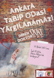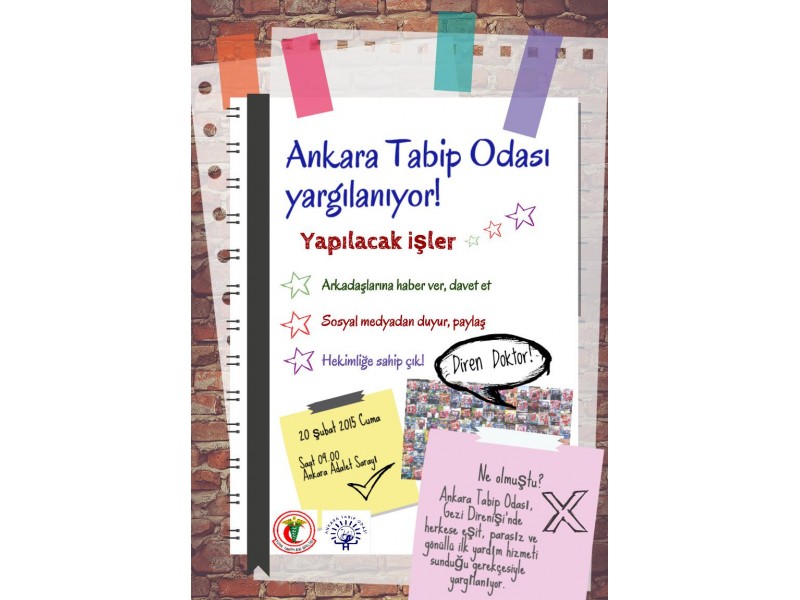 Ankara Tabip Odası Gezi Direnişinde eşit ,parasız ve gönüllü ilk yardım hizmeti sunduğu gerekçesiyle yagılandığı dava için 20 Şubat 2015 Cuma günü saat 09:00 ' da Ankara Adliyesi önünde buluşuyoruz.